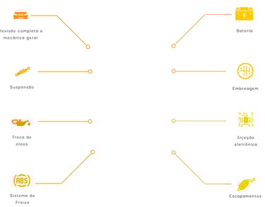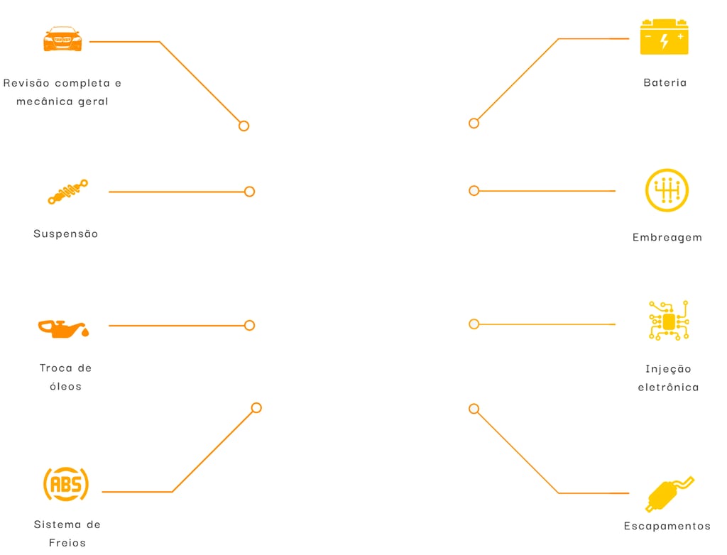 Troca de Pneu | Troca de Óleo de Câmbio | Revisão Geral | Suspensão | Freios | Injeção Eletrônica | Higienização de Ar Condicionado | Discos e Pastilhas de Freio | Troca de Velas e Cabos | Embreagem | Troca de Óleo do Motor | Direção| Arrefecimento